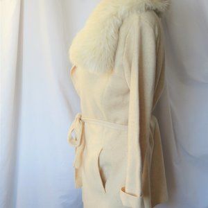Escada Oatmeal Belted Sweater Jacket Faux Fur Trim