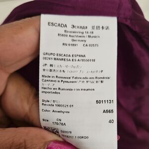 This knee-length pencil skirt by Escada is crafted in a deep purple hue, featuring elegant gold grommet embellishments that add a sophisticated touch. The structured fabric and classic silhouette make it ideal for both work and cocktail occasions, ensuring you look polished and chic.