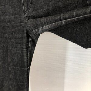 Lamb nappa leather trim on back pockets and waistline. Intentional distress on front thigh toward inner & back thigh. Line fold down the front legs give it a trouser look. Fabric has black with white speckles throughout, giving a light black colour. Jean has stretch to it. Couple scratches to back right pocket, light wear on leg hem, good condition otherwise.