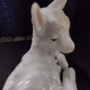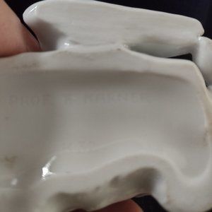 Wonderful rare Kaerner goat/kid in porcelain, made by the Eschenbach factory (assumed). The manufacturer's stamp has worn off, but Prof. Th. Karner who was a prolific animal sculptor for Rosenthal, Nymphenburg and then after WW2, Eschenbach, is stamped on the base. In excellent vintage condition, no chips, cracks or other imperfections seen. Hand-painted, and wonderfully textured and realistic. A small piece of porcelain must have come off the interior mold as it rattles but there is no damage to the exterior.