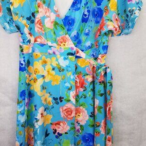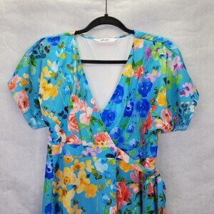 Eshakti Wrap Dress Midi S Dolman Sleeve Blue Floral Print Crepe Lined Tie Waist