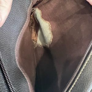 Condition: the left strap is barely holding on, as shown in picture, but someone with good sewing skill should be able to fix this. The inside also has a tear in the bottom