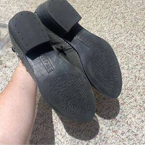 Picturing a pair of grey booties with silver buckle hardware by Esprit in a womens size 6.5. Perfect for fall.