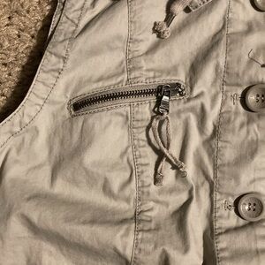 Esprit beige hooded button up sleeveless cargo vest. No stains or tears. The front hood buttons do like to come out and are very hard to put back in. It has 4 pockets. The size tag is cute off. I would say around M.