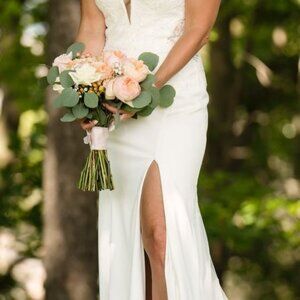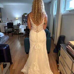 Essence of Australia D339, Ivory, size 12 (bridal size), will fit a normal size 8, I'm 5' 7" 140 lbs. Paid $2,300 in 2023. Has not been dry cleaned, a little bit dirty at the bottom. Bustles were placed by professional that allows the train to fall nicely (pic #2).