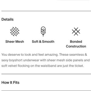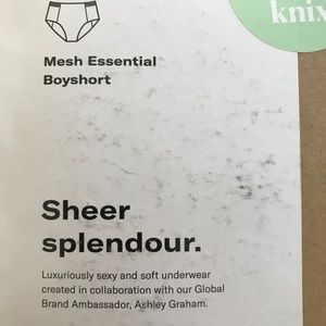 Mesh Essential Boyshort panty underwear in black, with sheer mesh side panels. Size XS fits hips 30" - 33", pant size 00 - 0. Measures approximately 33 cm across the waist and 23.5 cm waist to crotch. They have zero absorbancy, as these are regular everyday underwear. New In Box- boyshorts not worn. Note: photos with model are an example to show detail.