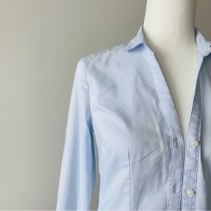 Classic light blue casual button down shirt. Perfect shirt for the office. Darts on front and back provide a tailored feminine silhouette.