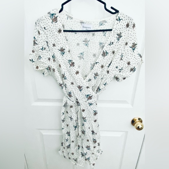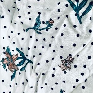 Elegant dress with subtle floral accents. Features a stylish polka dot design.