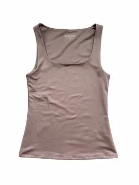 Fitted sleeveless tank with scoop neckline. Smooth ribbed knit fabric. Versatile everyday layering piece.