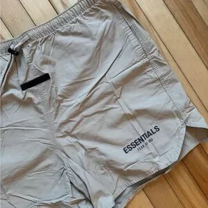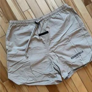 Light tan shorts with drawstring waist. Essentials branding on label.