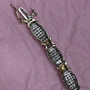 This Estate Find 10k Yellow & White Gold Oval 3TW Diamond Cluster Tennis Bracelet features 377 round white/colorless diamonds set in white and yellow gold with a hidden open box clasp and safety lock closure. The vintage bracelet is perfect for special occasions like engagements, weddings, anniversaries, birthdays, and Christmas. Signed by JWOR, this beautiful piece exudes beauty and love, making it a luxurious and timeless addition to any jewelry collection. With its adjustable and stackable design, this bracelet offers versatility and elegance for everyday wear. Please see the pictures for the tests made on this bracelet.