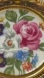 This beautiful estate sale pendant features a hand-painted floral bouquet on a porcelain or ceramic-like surface. The bouquet includes pink, white, and purple roses with blue and orange accent flowers, all set within a detailed, multi-layered gold-tone metal frame. The intricate filigree design of the outer frame and the ornate twisted rope border on the inner bezel suggest a Victorian or romantic revival style.