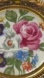 This beautiful estate sale pendant features a hand-painted floral bouquet on a porcelain or ceramic-like surface. The bouquet includes pink, white, and purple roses with blue and orange accent flowers, all set within a detailed, multi-layered gold-tone metal frame. The intricate filigree design of the outer frame and the ornate twisted rope border on the inner bezel suggest a Victorian or romantic revival style.