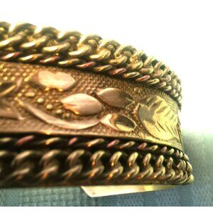 Etched Brass Cuff Bracelet Wide Boho Statement Cuff with Chain Border Vintage