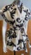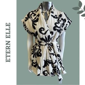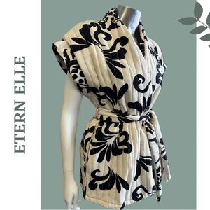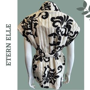 Stylish vest with bold black patterns on a creamy white background. Perfect for layering. Chic cap sleeves with self tie belt. Quilted fabric
