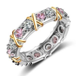 Inspired by the Tiffany Eternity Crisscross Statement Ring, this captivating ring features white and ruby pink cubic zirconia set in 925 Sterling Silver with 10k white and yellow gold plating.