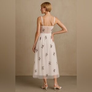Step into timeless romance with the Ethereal Garden Mesh Midi Dress, a dreamy cami-style piece perfect for weddings, spring celebrations, and special occasions. Crafted from a soft knitted fabric with a delicate semi-sheer floral, plant, and butterfly print, this midi dress features adjustable straps, a flattering high waistline, and a flared hem for graceful movement. The contrast mesh overlay adds a whimsical touch, while the knotted bodice detail and concealed back zipper ensure a polished finish. Fully lined for comfort, this dress combines elegance with a slight stretch for a comfortable, regular fit.