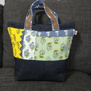 Madd from denim fabric and stitched sturdy and nice. has an intricate patchwork done with different cotton fabric.