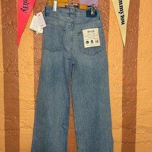A wide leg and a high rise with front pockets create a retro silhouette. A fade-resist sustainable fabric made from a super soft recycled cotton and modal blend denim. 1% for the planet!