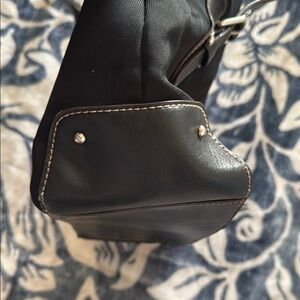 This black shoulder bag features a sleek, structured design in a canvas material with leather straps. Its silver-tone hardware adds a touch of elegance, making it a versatile accessory for everyday use. The bag's timeless silhouette ensures it remains a staple in any wardrobe.