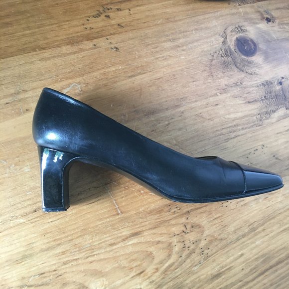 Classic black leather pumps with patent toe made with high quality leather. Excellent condition as can be seen in the photos. Timeless style. Perfect heel height. Made in Spain. I would keep for myself if they were my size as the leather feels so nice!