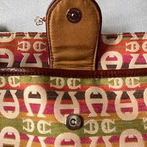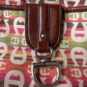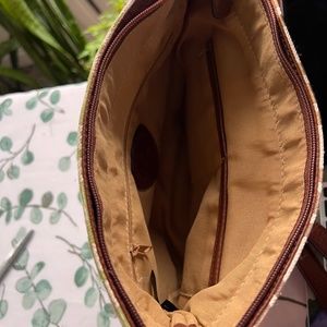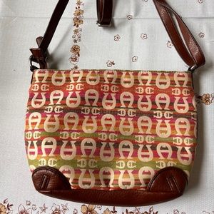 Like new!! A stunning crossbody bag by Etienne Aigner with caramel coloured interior. Made of cotton / poly canvas with manmade trim, strap and base. Zippered closure and one zippered pouch inside. Also has 2 non zippered pouches inside and one pouch behind the domed clasp on the outside of the bag. Very clean inside and out and from a smoke free home. Bag measures approx 8 inches tall and 12 inches wide at the widest point at the top and tapers to 9 inches wide at the base. Strap measures approx 30 inches in length and is fully adjustable.