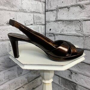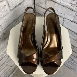 Etienne Aigner Ophelia Open Toe Sling Back Brown Patent Faux Leather Sandals