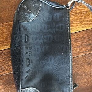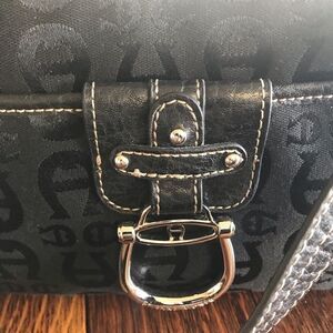 In excellent condition, vintage Etienne Aigner leather and monogrammed cloth small hobo style handbag. Clean interior, no marks, scuffs or imperfections.