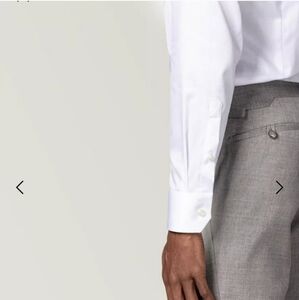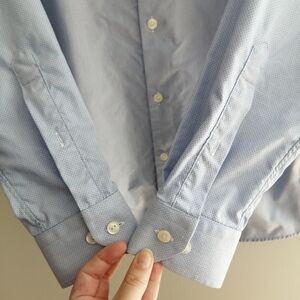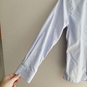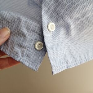 Shirt itself is in excellent condition but the higher sleeve button is missing on both arms as shown. If worn under a suit or blazer or rolled up it wouldn't matter but there are a couple options-you could use the 1 extra button the shirt comes with plus the bottom button if you'll tuck it in or the sleeve cuffs have 2 tightness levels and you could take the one you don't need. Priced with this in mind