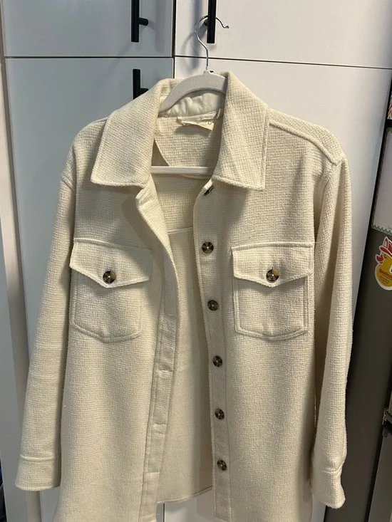 Etro jacket in a soft cream hue. Textured fabric with a relaxed shirt-jacket silhouette. Front button closure and two chest flap pockets. Polished, versatile layering piece.