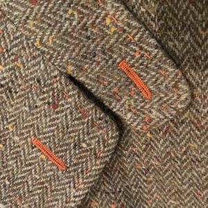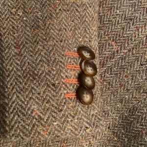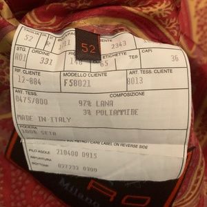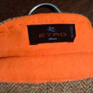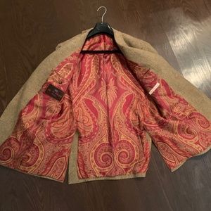 FABULOUS Blazer from Etro! Excellent condition! 97% wool - 3% polyamide superb fabrication as always with this brand. Taupe/khaki/gold colour combo. Contrast printed lining in paisley pattern, a typical Etro signature detail. Contrast orange wool inserts inner collar. Size 52, true to size! Chest circumference 1 inch below armholes is 44 inches and back length is 31 1/2 inches. Sleeve length from shoulder point 25 inches.