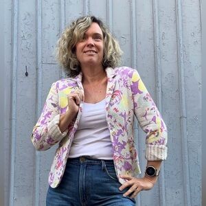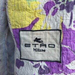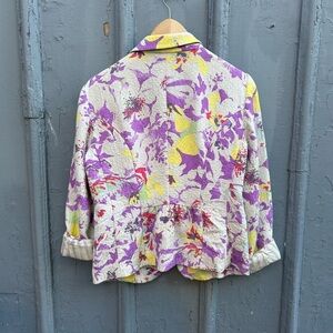 Stunning Etro Floral Blazer. I believe it is a linen blend of some sort. Raised brocade style texture, floral pattern with a striped interior lining. Rear has a small peplum or ruffle back to it. Just a stunning piece.