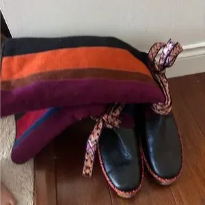 Vibrant boots with a mix of colors. Features a unique pattern and textured design. Perfect for a bold fashion statement.