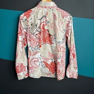 Stylish paisley button-up blouse with red and beige patterns. Perfect for casual or formal wear.