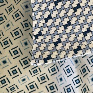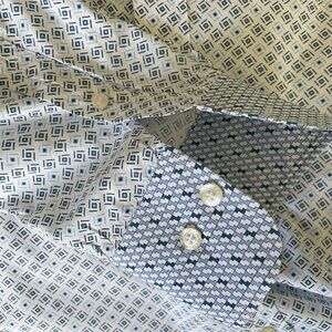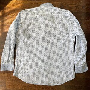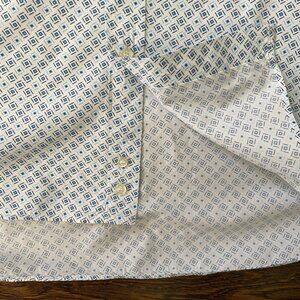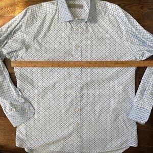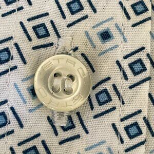 Selling an Etro long-sleeve button-up Cotton shirt White with Blue Geometric pattern-Size 44. 100% cotton. The shirt features a classic collar, buttoned cuffs, and a curved hem. Made in Italy. Pristine pre-loved condition.