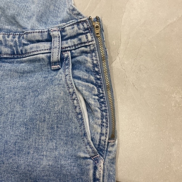 These cute acid wash skinny jean overalls features pink stitching, adjustable straps, one front pocket located chest area, two open side pockets, one left side zipper in good working condition.