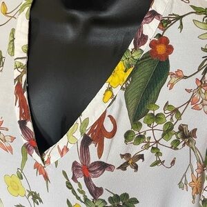 Feminine floral top with a beautiful colourful pattern. Would be great for the office or a semi-casual event. The material provides no additional stretch. No noted issues during inspection.