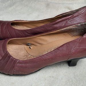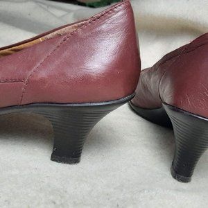 Leather pumps, round toes, vintage style, good condition except some cracks in the interior. Color is a dark dusty rose, not burgundy.