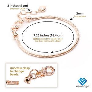 Adjustable Design: Your bracelet comes ready to wear, filled with beads and charms on a rose gold-plated snake chain bracelet. The lobster clasp twists open on one end so that the bracelet can easily be re-arranged or added to.