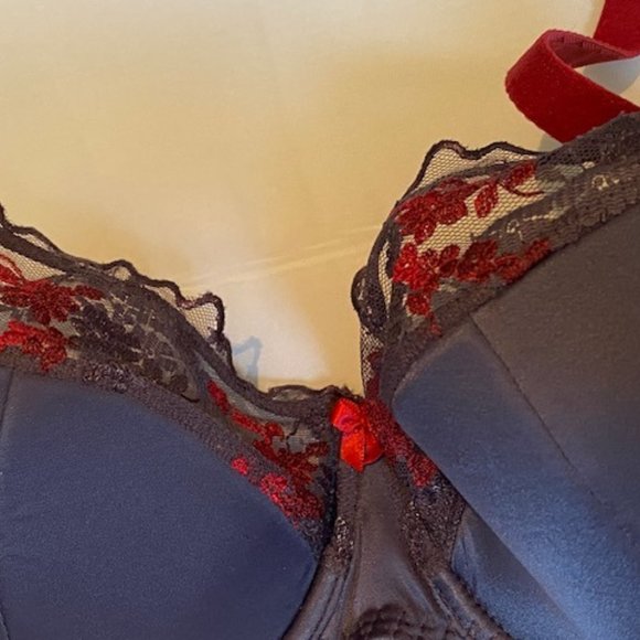 - Dark dusty blue satin, with Cherry Red straps and embroidered lace