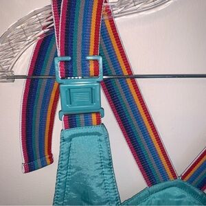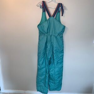 Chic teal snow bib overalls by Euroski. Ideal for winter adventures. Rainbow straps.
