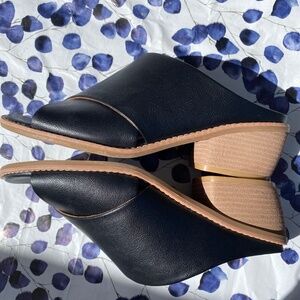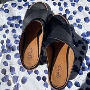 Gorgeous black leather like Eurosoft mules by Sofft. Excellent, like new condition as only tried on. Faux leather footbed lining with soft lining inside for additional comfort. Crossover faux leather straps keep feet from sliding. Back heel height approximately 1.5” for comfortable walking.