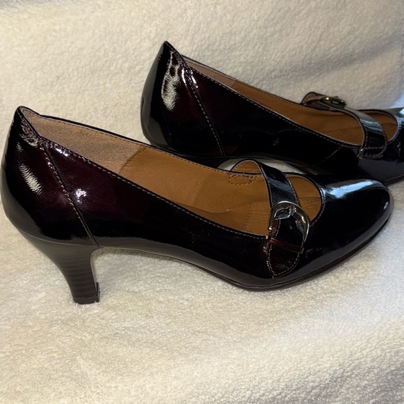Step out in style with these elegant Eurosoft brown patent leather heels. Mary Jane style. Perfect for any occasion, these shoes offer both comfort and sophistication. Office, business, professional, classy, comfy.