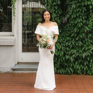 Selling my wedding dress of my dreams! This is the "Jess" dress by designer Eva Lendel. It's an off the shoulder, bias cut dress and comes with a detachable train. It's made of a rich fabric that's very flattering and feels very expensive.
