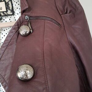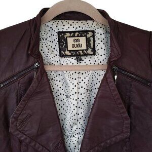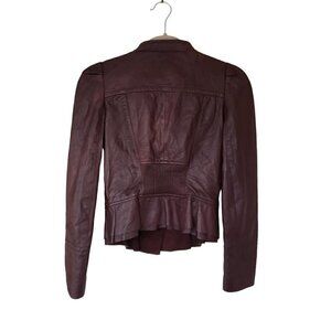 Eva Ouxiu Burgundy Lambskin Leather Crop Slim Fit Ruffled Moto Jacket