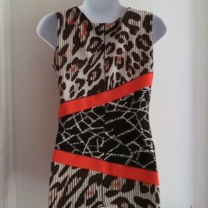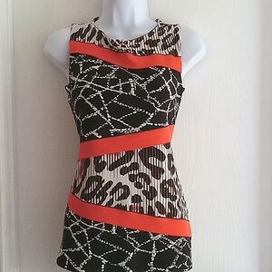 Capture the essence of summer and beyond with this stunning sleeveless top. A blend of orange and white in a black animal print design makes it