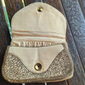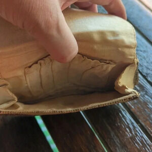 This was my Grandmother 's and possibly her Mother's. I think its from the 1930's. I also think its made of satin and the beads may have been silver lined inside , but are now tarnished and have lost their sparkle. (This is a common occurrence with this type of bead.)