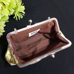 70's style cloth clutch purse with big flowers in apple / chartreuse green on a beige, off white. Hang on the wrist or tuck the silver metal chain inside and convert to an evening clutch! Chain is attached with two lobster claw clasps, making the chain is to remove if wanted. Kiss lock at the top. Silver tone metal bracket. Lined in earthy brown fabric.