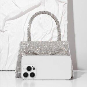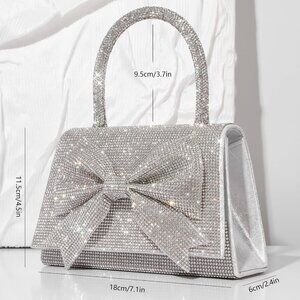 Gliter evening purse features gorgeous double bow with shiny rhinestones embellished, frosted with glistening sheen and top handle, flap by a strong magnetic buckle, complementing your elegant attire for important events.