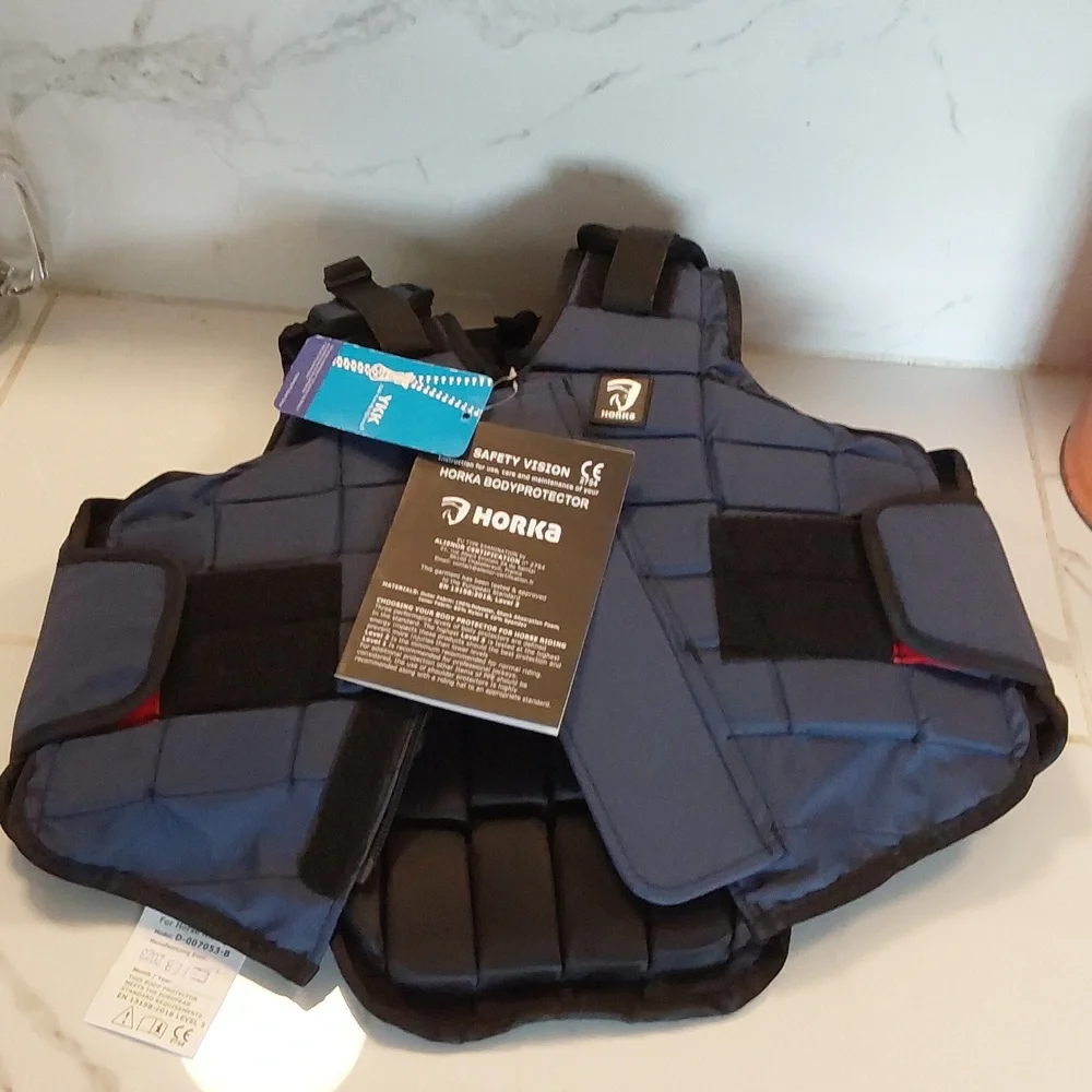 Horka (Dutch elite brand) event vest. Size medium child. see size chart. Brand new with tags. Navy. Certified to European 2018 standards level 3. highest protection for eventing and jumping.